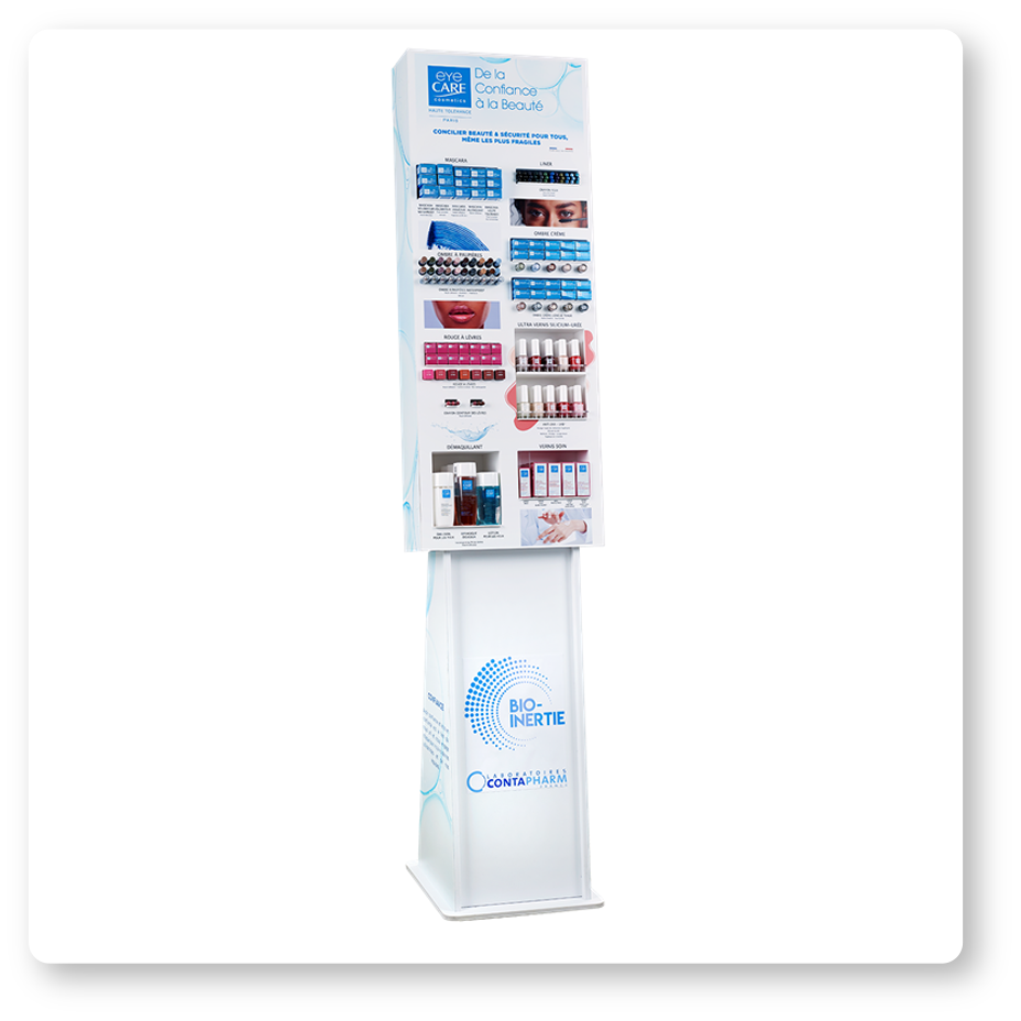 2m high, free standing column display thatholds 12 Eye Care product modules